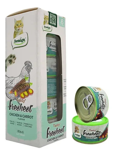 Nuestro Alimento Humedo para Gatos Tasty+ Freshest Can usa autentica carne de pollo y Zanahoria, baja en grasas, alta en proteinas, rica en acidos grasos insaturados, sobrosa y fresca.